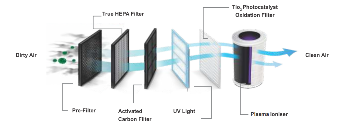 Every Crusaders Air Purifier features a multi-layered purification system. This 6-stage physical filtration mechanism ensures maximum pollutant removal and sterilization of indoor air: